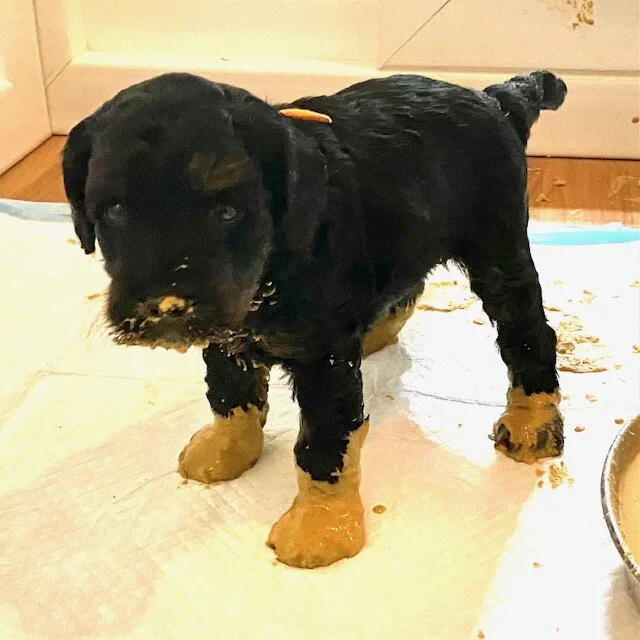 Porridge week is the best for photos. These pups may be half the size that Mila’s were, but they eat porridge like they’re twice the size. The whelping box now has a potty area, sleeping area, lots of toys, and outer visiting area for cuddling. The boys are naturals at keeping the areas as titled - for the most part;) Their wobbles have turned into hops and miniature trots, and their adorable “tough boy” voices are more like sopranos than baritones. Snuggles with these precious dudes is easily the best part of the day for those of us at Ever After.