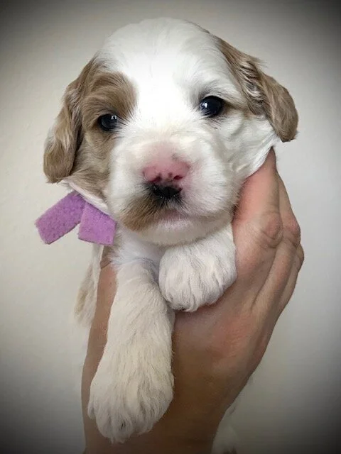 May I be honest - picture time with your little darlings is more like an aerobic workout than a point-and-shoot affair, ha! Numerous pictures are taken of puppies squirming, slipping, chewing on each other, half-opening their eyes, and yawning for yet another nap before that one shot of semi-perfection is achieved. Still, it’s all worth it. Week 5 brought conquering eating instead of swimming in their puppy porridge (warmed up, formula-soaked kibbles), enjoying water as a second-favorite beverage, crate training, playing in a larger pen with additional litter boxes, and more experiences for desensitization (i.e. light-up/noisy/moving toys, grass turf in their outdoor puppy play yard, nubby side of a balance stability bubble, crinkle tunnel, dog puzzle toy - brain exercise, and thunder storms - definitely an Achilles heel for one of the nameless pups). But most of all, puppies were lavished with attention from Ever After’s revolving family of 8-9 dog lovers as well as Mother Mila. No one tires of puppy kisses and the touch of soft “bunny” fur. BTW - your babies are sleeping 5 hours during the night now!