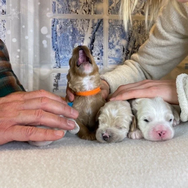 Although still develping, the puppies eyes started opening this week! It’s so fun seeing their eyes peeking through those sleepy eyelids. With only nine milk faucets and nine puppies, they still managed to plump up quite well. The puppies mastered the technique of staying put on their faucets until the milk comes down at least twice. Mila is lovingly willing at each feeding. Sharp little baby nails were cut with a human clipper this week. Check out the nail cutting video on the RESOURCES page for a guide to cutting your dog’s nails. Lastly, Ever After is often asked how we pose our puppies. Let’s just say that it’s a process not to be rushed;)