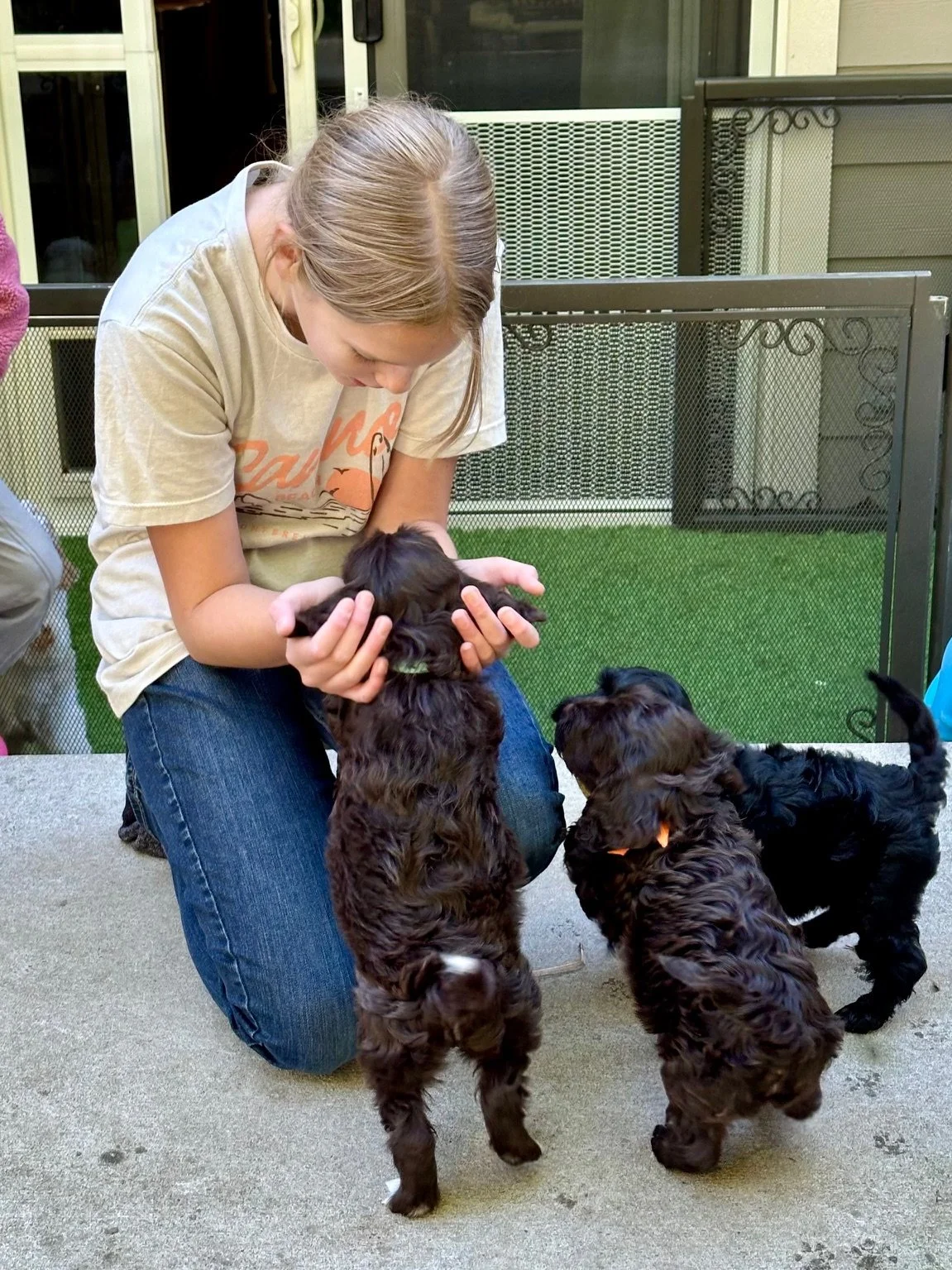 Penny’s guardian family is the best for socializing these active Olympians. Social experiences are something we take very seriously. Ever After’s Australian Labradoodle puppies are around people and dogs (our family dogs) of all ages. It helps so much as the puppies make the transition from Mom (who is starting the weaning process) to putting full trust in humans and other pets in preparation for future families. The puppies also get an average of 2-3 car rides, and these eight have been doing great with those. At adoption time, we give families fun ways to continue to expose their puppies to the big world of never-ending experiences for the most well-adjusted family dogs. The following pictures were a blast to take with these sweet pups!